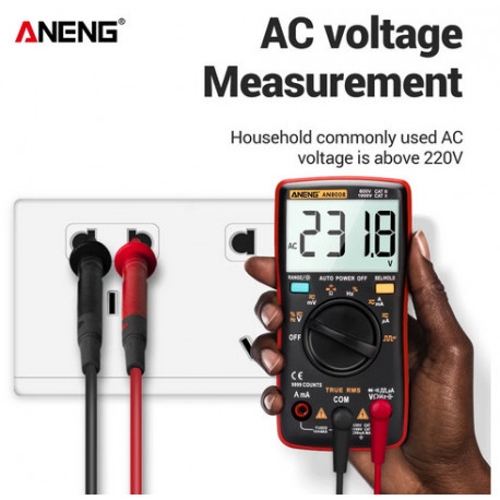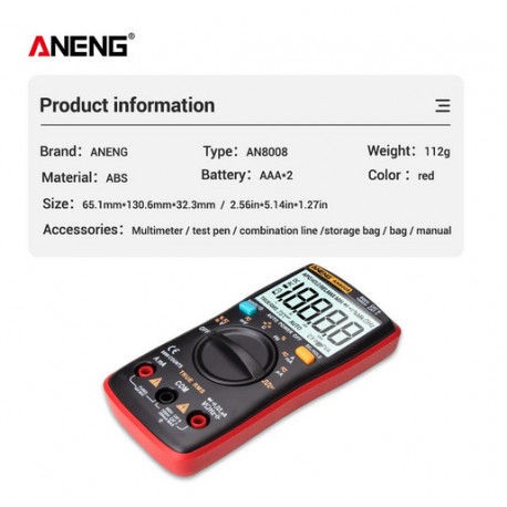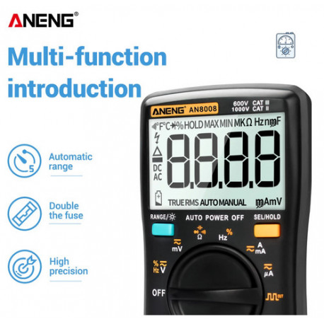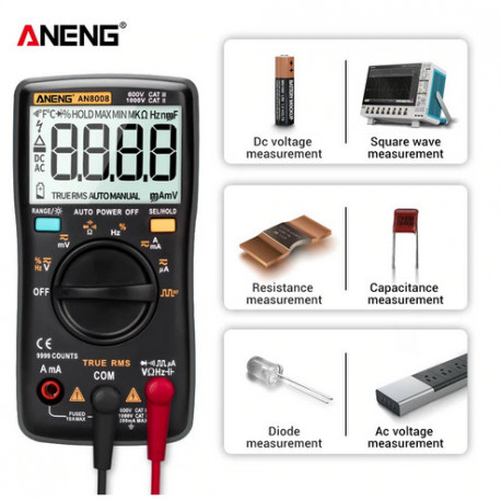 Multimetr ANENG AN8008 umožňuje měření parametrů obvodu, jako je napětí (volty), proud (ampéry), odpor (ohmy), kapacita(farady), frekvence(hertzy) a test diod. Digitální multimetry také nabízejí širokou škálu možností měření střídavého a stejnosměrného proudu pro různé aplikace.