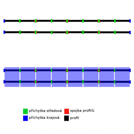Délka konstrukce 8,4m je složena z 2 profilů o délce 2080mm (2×) a 2210mm (2×), které jsou spojeny spojkami profilů.