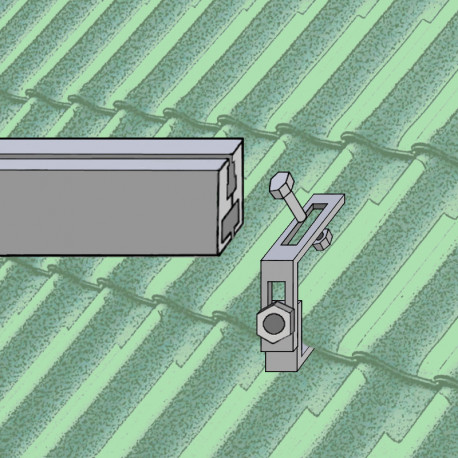 Dle typu solárních panelů se upravují velikosti příchytek. Hák se připevňuje do trámů pomocí 2 ks vrutů.
